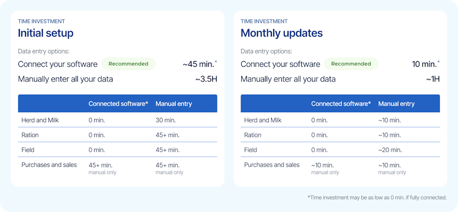 Connecting software means faster setup and less work each month. Below is an estimation of how much time each method takes. You can mix and match the approach. Start with connecting the data you have available, enter the rest manually and expand your software connections over time.