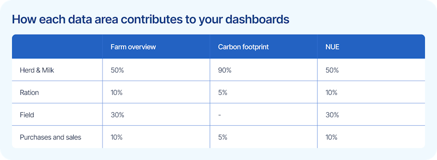 MSC analyzes your farm based on five key data areas: Herd, Milk, Ration, Field, and, Purchases and Sales. Each of these data areas contribute to the insights on the three available dashboards: